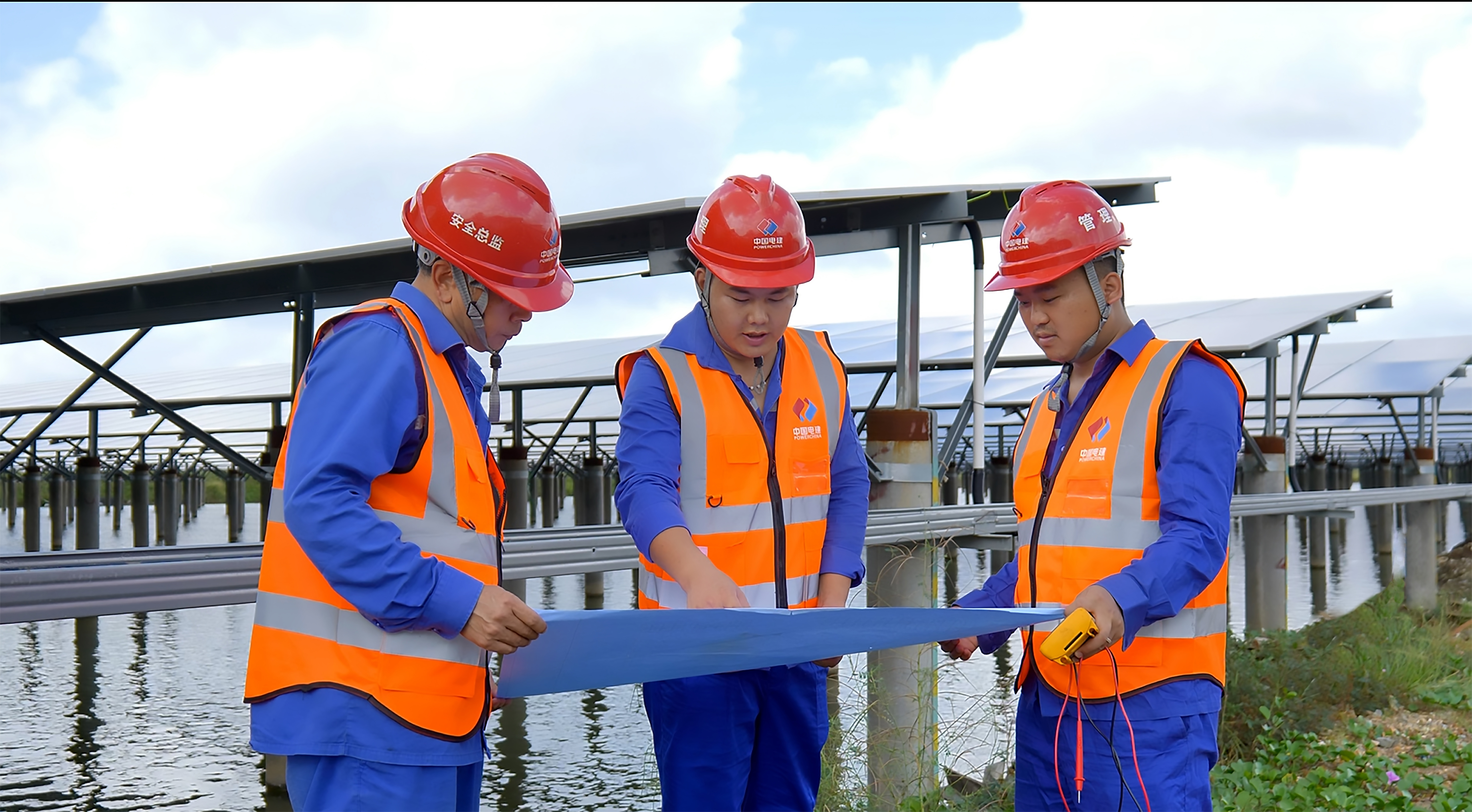 當第一縷玫瑰金晨曦刺破南海云層,將剛剛建成投產的廣東臺山鑫昊150兆瓦漁光互補項目從萬畝魚塘上喚醒,凝結著夜露的高效光伏組件陣列,如同深藍綢緞鋪展水面,在初陽下折射出鉆石般的光芒。藍色光伏板下,魚蝦在清涼水域中舒展觸須,漁民劃著小舟穿行于4米多高的光伏廊道,船櫓劃破鏡面般的水面,驚起白鷺掠過樁基形成的幾何森林。這幅動態生態畫卷,正是中國電建集團貴州工程有限公司(以下簡稱”貴州工程公司“)以EPC總承包模式,在粵港澳大灣區繪就的綠色能源宏偉畫卷。